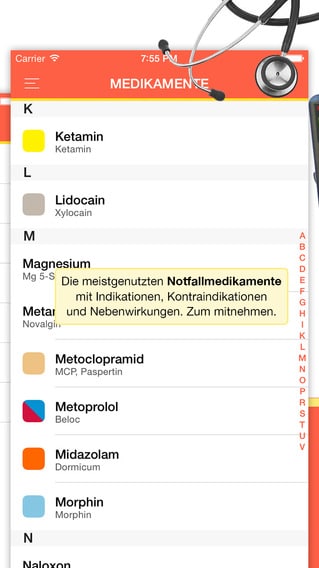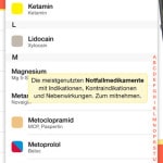 Ein weiteres Feature der Rettungsdienst App ist die Medikamenten-Übersicht. Über 60 der gebräuchlichsten Notfallmedikamente sind in die App integriert. Zur einfachen und intuitiven Nutzung sind alle Medikamente zusammen mit ihrem DIVI-Code dargestellt. Zu allen Medikamenten werden Indikationen, Kontraindikationen und Nebenwirkungen erläutert. Ebenso werden Dosierungshinweise zu verschiedenen Indikationen gegeben. Ein Medikamentenrechner ist leider nicht Teil der App, obwohl er bei einigen vom Körpergewicht des Patienten abhängigen Dosierungen durchaus sinnvoll wäre.
