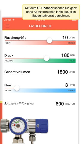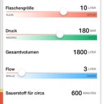Die App enthält dafür einen Sauerstoff-Rechner. Über einen Slider können Flaschengröße, Druck und O2-Flow angegeben werden. Berechnet wird dann das zur Verfügung stehende Gesamtvolumen und für wieviele Minuten der vorhandene Sauerstoff reicht.