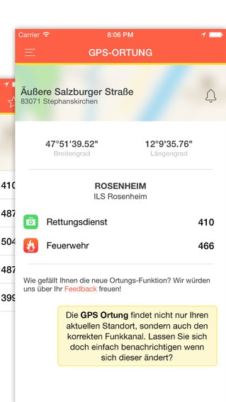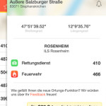 Als besonders praktisch hat sich die GPS Ortung der App erwiesen. Über die Ortungsdienste des iPhone kann der aktuelle Standort bestimmt werden. Neben der Adresse (von der z.B. die Postleitzahl für den Transportschein wichtig sein kann) werden auch GPS Koordinaten angezeigt. Dies ist oftmals wichtig für die Anforderung eines Rettungshubschraubers, z.B. in offenem Gelände oder in den Bergen. Des Weiteren zeigt die Ortungsfunktion die aktuell zuständige Leitstelle samt Funkkanälen (analog & digital) an. Ein besonders hervorzuhebendes Feature ist die Möglichkeit sich über Push-Benachrichtigungen informieren zu lassen sobald sich die zuständige Leitstelle ändert. Ideal für Verlegungsfahrten im gesamten Bundesgebiet.